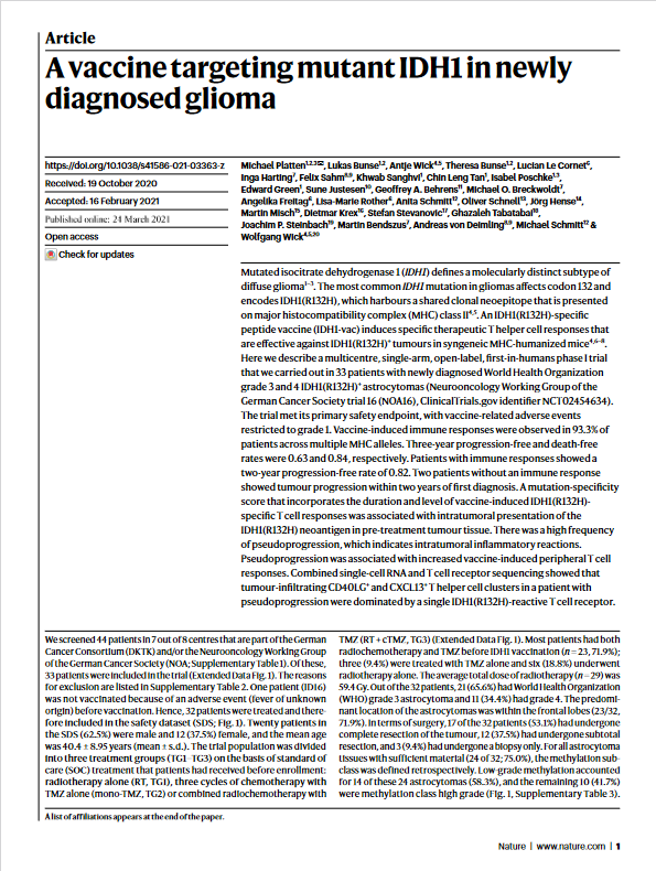 In their recently published study, Platten et al. describe a multicentre, single-arm, open-label, first-in-humans phase I trial that were carried out in 33 patients with newly diagnosed World Health Organization grade 3 and 4 IDH1(R132H)+ astrocytomas. The DKFZ announces "Promising preclinical results" in their press release from March 2021. The authors remark that “We cannot draw any further conclusions about the vaccine efficacy from this early study without a control group”. However, a phase II study to examine whether the IDH1 vaccine leads to better treatment results than the standard treatment alone is being prepared.