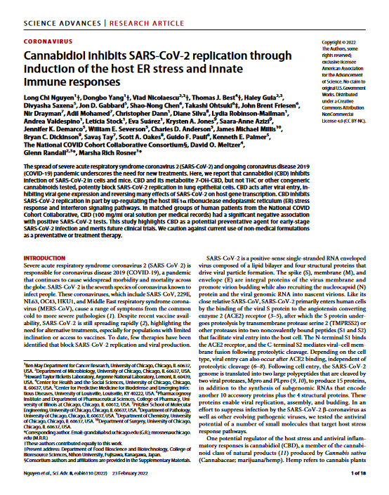 The spread of severe acute respiratory syndrome coronavirus 2 (SARS-CoV-2) and ongoing coronavirus disease 2019 (COVID-19) pandemic underscores the need for new treatments. Here, we report that cannabidiol (CBD) inhibits infection of SARS-CoV-2 in cells and mice. CBD and its metabolite 7-OH-CBD, but not THC or other congeneric cannabinoids tested, potently block SARS-CoV-2 replication in lung epithelial cells. CBD acts after viral entry, inhibiting viral gene expression and reversing many effects of SARS-CoV-2 on host gene transcription. CBD inhibits SARS-CoV-2 replication in part by up-regulating the host IRE1α ribonuclease endoplasmic reticulum (ER) stress response and interferon signaling pathways. In matched groups of human patients from the National COVID Cohort Collaborative, CBD (100 mg/ml oral solution per medical records) had a significant negative association with positive SARS-CoV-2 tests. This study highlights CBD as a potential preventative agent for early-stage SARS-CoV-2 infection and merits future clinical trials. We caution against current use of non-medical formulations as a preventative or treatment therapy.
