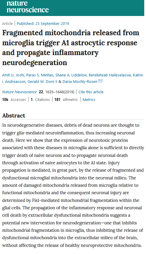 Efforts to reduce the personal and societal burden of neurodegenerative disease (ND) hinge on the identification of the underlying molecular mechanism(s) that causes neuronal death. One common aspect of neuronal death in Alzheimer’s disease (AD), amyotrophic lateral sclerosis (ALS), and Huntington’s disease (HD) is the relationship to the buildup of neurotoxic proteins. Glial cells, normally neuroprotective, can be transformed into a neuroinflammatory state (“A1” for astrocytes) stimulated by this neuronal detritus and by microglial activation. Interestingly, pathological mitochondrial fission mediated by Drp1-Fis1 interaction (as opposed to physiological fission through Drp1-Mff) is also a characteristic of many ND. In their new study, Joshi et al. used various mouse ND models to reveal a process where microglia expressing neurotoxic proteins released dysfunctional and fragmented mitochondria that drove A1 astrocyte-triggered neuroinflammation and subsequent innate immune-mediated neuronal death, with the resultant debris contributing to additional inflammation. Importantly, disruption of the Drp1-Fis1 interaction ameliorated these effects. The authors stressed that the fate of neurons was determined by the extracellular ratio of damaged to normal mitochondria, which was dependent on the amount of pathological fission in microglia. Together, the results suggest that inhibition of Drp1-Fis1-mediated mitochondrial fission, with the goal of increasing the ratio between functional and damaged mitochondria, may offer a new approach to neuroprotection in various NDs.