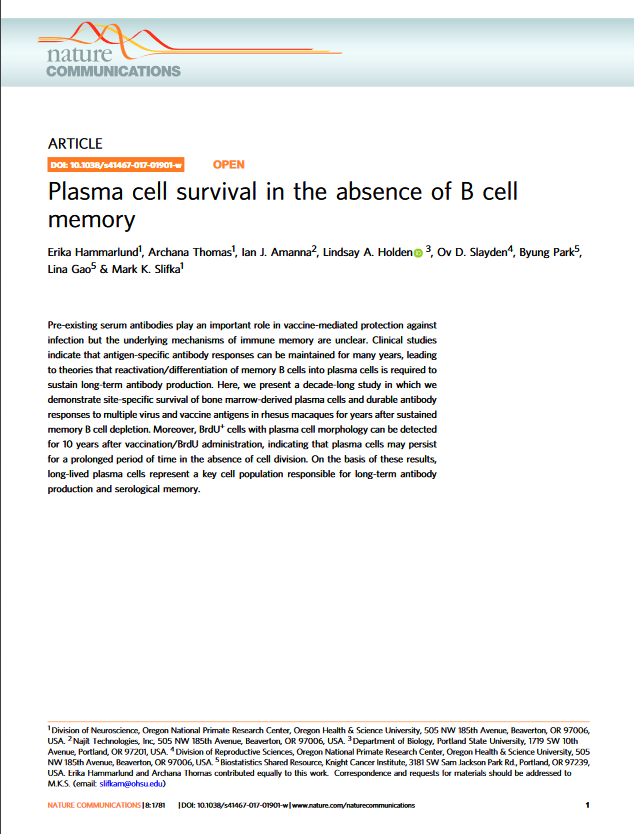 Pre-existing serum antibodies play an important role in vaccine-mediated protection againstinfection but the underlying mechanisms of immune memory are unclear. Clinical studiesindicate that antigen-specific antibody responses can be maintained for many years, leadingto theories that reactivation/differentiation of memory B cells into plasma cells is required tosustain long-term antibody production. Here, we present a decade-long study in which wedemonstrate site-specific survival of bone marrow-derived plasma cells and durable antibodyresponses to multiple virus and vaccine antigens in rhesus macaques for years after sustainedmemory B cell depletion. Moreover, BrdU+cells with plasma cell morphology can be detectedfor 10 years after vaccination/BrdU administration, indicating that plasma cells may persistfor a prolonged period of time in the absence of cell division. On the basis of these results,long-lived plasma cells represent a key cell population responsible for long-term antibodyproduction and serological memory.
