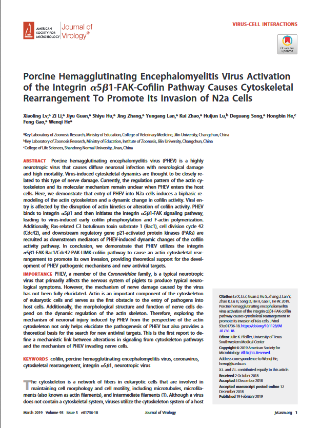 Porcine hemagglutinating encephalomyelitis virus (PHEV) is a highly neurotropic virus that causes diffuse neuronal infection with neurological damage and high mortality. Virus-induced cytoskeletal dynamics are thought to be closely related to this type of nerve damage. Currently, the regulation pattern of the actin cytoskeleton and its molecular mechanism remain unclear when PHEV enters the host cells. Here, we demonstrate that entry of PHEV into N2a cells induces a biphasic remodeling of the actin cytoskeleton and a dynamic change in cofilin activity. Viral entry is affected by the disruption of actin kinetics or alteration of cofilin activity. PHEV binds to integrin α5β1 and then initiates the integrin α5β1-FAK signaling pathway, leading to virus-induced early cofilin phosphorylation and F-actin polymerization. Additionally, Ras-related C3 botulinum toxin substrate 1 (Rac1), cell division cycle 42 (Cdc42), and downstream regulatory gene p21-activated protein kinases (PAKs) are recruited as downstream mediators of PHEV-induced dynamic changes of the cofilin activity pathway. In conclusion, we demonstrate that PHEV utilizes the integrin α5β1-FAK-Rac1/Cdc42-PAK-LIMK-cofilin pathway to cause an actin cytoskeletal rearrangement to promote its own invasion, providing theoretical support for the development of PHEV pathogenic mechanisms and new antiviral targets.