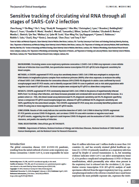RESULTS. CRISPR-augmented RT-PCR consistently detected SARS-CoV-2 RNA in the plasma of experimentally infected NHPs from 1 to 28 days after infection, and these increases preceded and correlated with rectal swab viral RNA increases. In a patient cohort (n = 159), this blood-based assay demonstrated 91.2% diagnostic sensitivity and 99.2% diagnostic specificity versus a comparator RT-qPCR nasal/nasopharyngeal test, whereas RT-qPCR exhibited 44.1% diagnostic sensitivity and 100% specificity for the same blood samples. This CRISPR-augmented RT-PCR assay also accurately identified patients with COVID-19 using one or more negative nasal swab RT-qPCR results.
