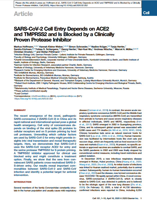 As described in their recent Cell study, Hoffmann et al. identified the serine protease TMPRSS2 as a critical factor in the priming of the SARS-CoV-2 spike protein with its receptor ACE2, and demonstrated that a clinically proven protease inhibitor, camostat mesylate, is able to interfere with SARS-CoV-2 infection of lung cells.
