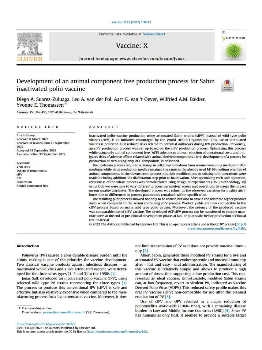 The resulting pilot process showed not only to be robust, but also to have a considerable higher product yield when compared to the serum containing sIPV process. Product yields are now comparable to the cIPV process based on using wild type polio viruses. Moreover, the potency of the produced vaccine was comparable that of cIPV vaccine. The developed ACF sIPV process can be transferred to vaccine manufacturers at the end-of pre-clinical development phase, at lab- or pilot scale, before production of clinical trial material.