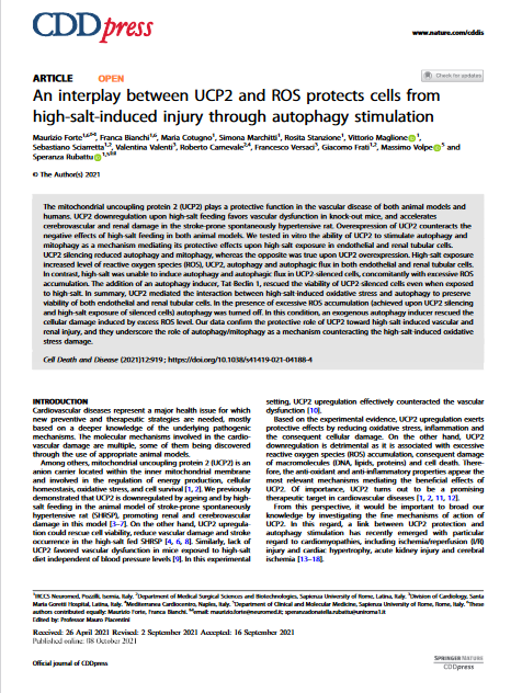 The mitochondrial uncoupling protein 2 (UCP2) plays a protective function in the vascular disease of both animal models and humans. UCP2 downregulation upon high-salt feeding favors vascular dysfunction in knock-out mice, and accelerates cerebrovascular and renal damage in the stroke-prone spontaneously hypertensive rat. Overexpression of UCP2 counteracts the negative effects of high-salt feeding in both animal models. We tested in vitro the ability of UCP2 to stimulate autophagy and mitophagy as a mechanism mediating its protective effects upon high-salt exposure in endothelial and renal tubular cells. UCP2 silencing reduced autophagy and mitophagy, whereas the opposite was true upon UCP2 overexpression. High-salt exposure increased level of reactive oxygen species (ROS), UCP2, autophagy and autophagic flux in both endothelial and renal tubular cells. In contrast, high-salt was unable to induce autophagy and autophagic flux in UCP2-silenced cells, concomitantly with excessive ROS accumulation. The addition of an autophagy inducer, Tat-Beclin 1, rescued the viability of UCP2-silenced cells even when exposed to high-salt. In summary, UCP2 mediated the interaction between high-salt-induced oxidative stress and autophagy to preserve viability of both endothelial and renal tubular cells. In the presence of excessive ROS accumulation (achieved upon UCP2 silencing and high-salt exposure of silenced cells) autophagy was turned off. In this condition, an exogenous autophagy inducer rescued the cellular damage induced by excess ROS level. Our data confirm the protective role of UCP2 toward high-salt-induced vascular and renal injury, and they underscore the role of autophagy/mitophagy as a mechanism counteracting the high-salt-induced oxidative stress damage.