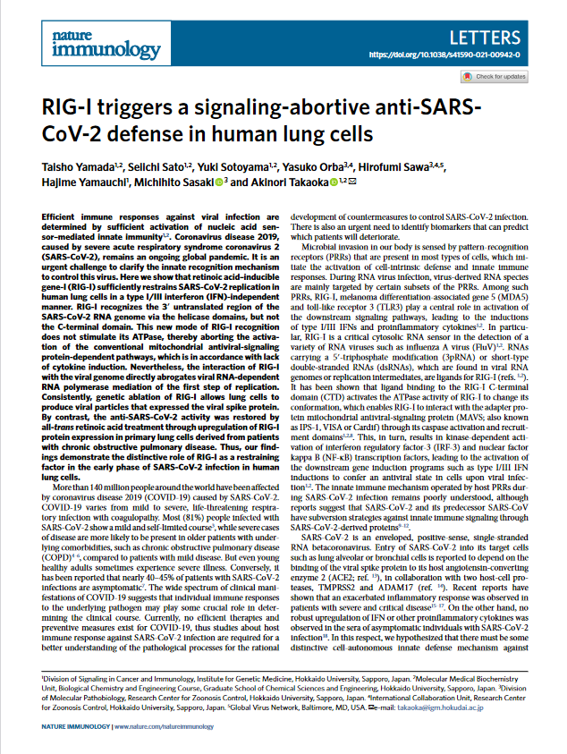 Efficient immune responses against viral infection are determined by sufficient activation of nucleic acid sensor–mediated innate immunity1,2. Coronavirus disease 2019, caused by severe acute respiratory syndrome coronavirus 2 (SARS-CoV-2), remains an ongoing global pandemic. It is an urgent challenge to clarify the innate recognition mechanism to control this virus. Here we show that retinoic acid–inducible gene-I (RIG-I) sufficiently restrains SARS-CoV-2 replication in human lung cells in a type I/III interferon (IFN)-independent manner. RIG-I recognizes the 3′ untranslated region of the SARS-CoV-2 RNA genome via the helicase domains, but not the C-terminal domain. This new mode of RIG-I recognition does not stimulate its ATPase, thereby aborting the activation of the conventional mitochondrial antiviral-signaling protein-dependent pathways, which is in accordance with lack of cytokine induction. Nevertheless, the interaction of RIG-I with the viral genome directly abrogates viral RNA-dependent RNA polymerase mediation of the first step of replication. Consistently, genetic ablation of RIG-I allows lung cells to produce viral particles that expressed the viral spike protein. By contrast, the anti-SARS-CoV-2 activity was restored by all-trans retinoic acid treatment through upregulation of RIG-I protein expression in primary lung cells derived from patients with chronic obstructive pulmonary disease. Thus, our findings demonstrate the distinctive role of RIG-I as a restraining factor in the early phase of SARS-CoV-2 infection in human lung cells.
