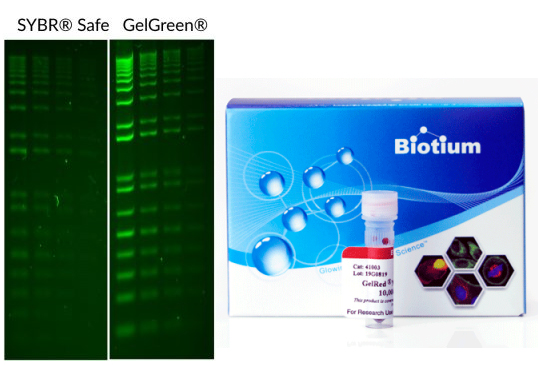 Biotium bietet das rot fluoreszierende GelRed® und das grün fluoreszierende GelGreen® als sichereren und sensitiven Ersatz für Ethidiumbromid.