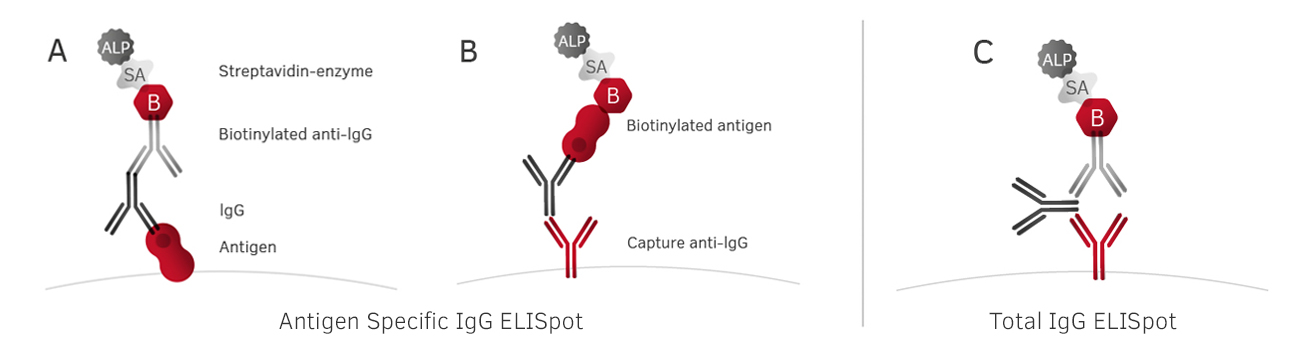 ABB: Schematische Darstellung des Prinzips des B-Zell-ELISpot-Assays. A und B zeigen die beiden Möglichkeiten zur Durchführung des antigenspezifischen B-Zell-ELISpot-Assays, wobei entweder Antigen zur Beschichtung (A) oder biotinyliertes Antigen zur Detektion (B) verwendet wird. C zeigt den ELISpot-Assay zur Bestimmung des Gesamt-IgG.