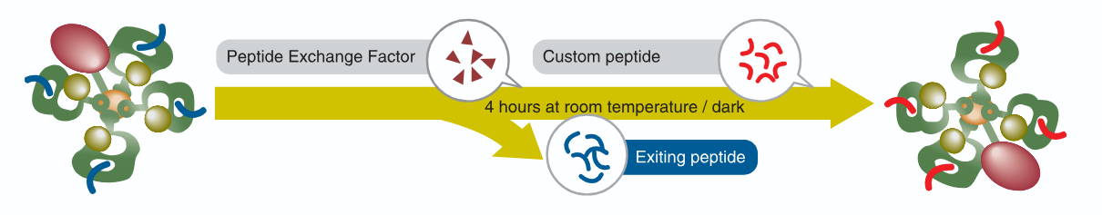 Die MHC-Tetramere in den QuickSwitch™ Custom Tetramer Kits sind mit dem „Exiting Peptid“ (blau dargestellt) vorgebunden, um die strukturelle Integrität zu erhalten. Der Austausch des Ausgangspeptids mit dem experimentellen Peptid (rot dargestellt) wird durch Zugabe des experimentellen Peptids und eines Peptidaustauschfaktors eingeleitet (die Reaktionszeit beträgt ca. 4 Stunden*). Die Effizienz des Peptidaustauschs hängt von der Sequenz des experimentellen Peptids ab. Die QuickSwitch™ Quant Tetramer Kits enthalten Reagenzien zur Bestimmung der Peptidaustausch-Effizienz.