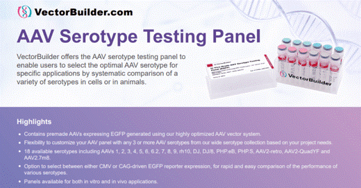 VectorBuilder bietet das AAV-Serotyp-Testpanel an, um den Benutzern die Möglichkeit zu geben, den optimalen AAV-Serotyp für spezifische Anwendungen durch systematischen Vergleich einer Vielzahl von Serotypen in Zellen oder in Tieren auszuwählen. Dieses Panel ist das einzige kommerziell erhältliche AAV-Serotyp-Testkit, das Ihnen die Flexibilität bietet, Ihr AAV-Panel mit drei oder mehr AAV-Einheiten aus unserer breiten Sammlung von 18 Serotypen auf Ihre Projektanforderungen abzustimmen. |