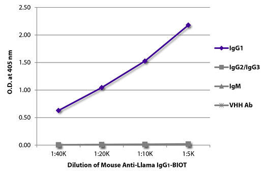 ELISA plate was coated with purified llama IgG1, IgG2/IgG3, IgM, and a VHH antibody. Immunoglobulins were detected with Mouse Anti-Llama IgG1-BIOT (SB Cat. No. 5870-08) followed by Streptavidin-HRP (SB Cat. No. 7105-05).