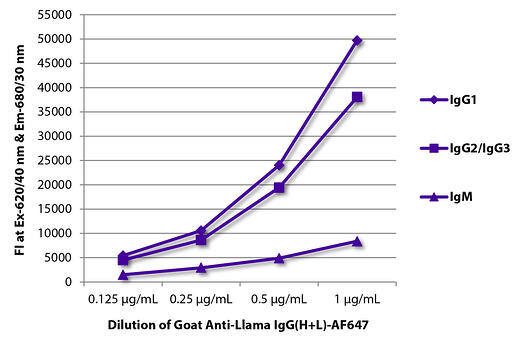 FLISA plate was coated with purified llama IgG1, IgG2/IgG3, and IgM. Immunoglobulins were detected with Goat Anti-Llama IgG(H+L)-AF647 (SB Cat. No. 6045-31).
