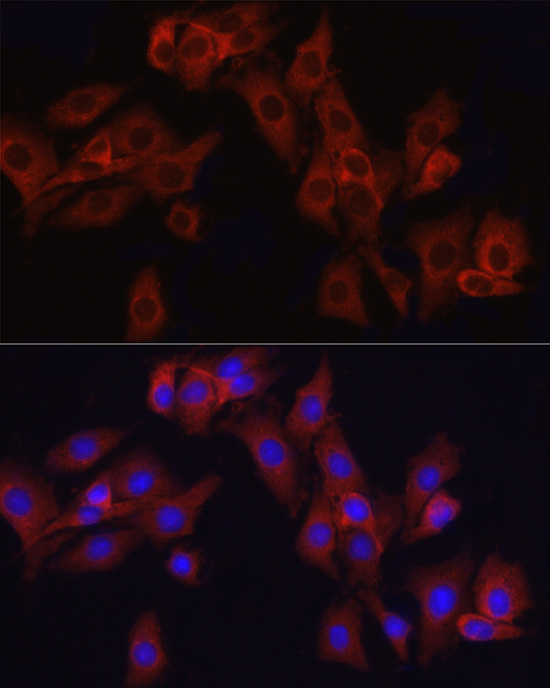 Immunofluorescence analysis of NIH/3T3 cells using ATF6 Rabbit pAb (A0202) at dilution of 1:50 (40x lens). Secondary antibody: Cy3-conjugated Goat anti-Rabbit IgG (H+L) (AS007) at 1:500 dilution. Blue: DAPI for nuclear staining. |
