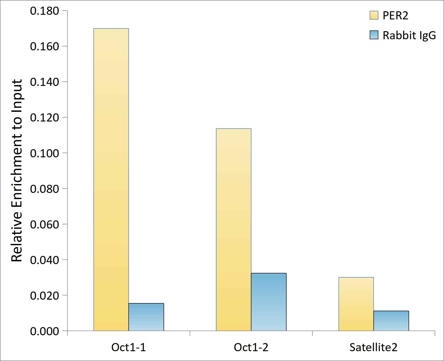 Chromatin immunoprecipitation analysis of extracts of MCF7 cells, using PER2 antibody (A13168) and rabbit IgG.The amount of immunoprecipitated DNA was checked by quantitative PCR. Histogram was constructed by the ratios of the immunoprecipitated DNA to the input.