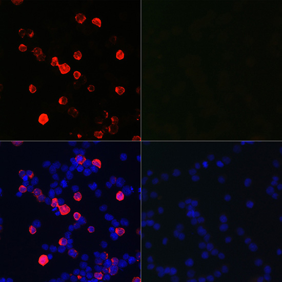 Immunofluorescence analysis of 293T-N and 293T cells using SARS-CoV-2 Nucleoprotein Rabbit pAb (A18797) at dilution of 1:100 (40x lens). Secondary antibody: Cy3-conjugated Goat anti-Rabbit IgG (H+L) (AS007) at 1:500 dilution. Blue: DAPI for nuclear staining.