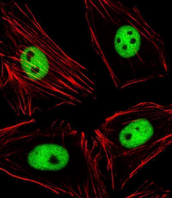 Immunofluorescent analysis of 4% paraformaldehyde-fixed, 0. 1% Triton X-100 permeabilized Hela (Human cervical epithelial adenocarcinoma cell line) cells labeling EZH2 with A00050-3 at 1/25 dilution, followed by Alexa Fluor 488-conjugated goat anti-rabbit IgG secondary antibody at 1/400 dilution (green). Confocal image showing nuclear staining on Hela cell line. Cytoplasmic actin is detected with Alexa Fluor 555 conjugated with Phalloidin at 1/100 dilution (red).
