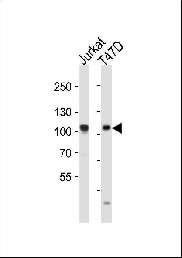 Western blot analysis of lysates from Jurkat, T47D cell line (from left to right), using EZH2 Antibody. A00050-3 was diluted at 1:2000 at each lane. A goat anti-rabbit IgG H&L(HRP) at 1:10000 dilution was used as the secondary antibody. Lysates at 20ug per lane.