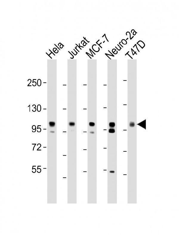 All lanes : Anti-EZH2 Antibody at 1:2000 dilutionLane 1: Hela whole cell lysateLane 2: Jurkat whole cell lysateLane 3: MCF-7 whole cell lysateLane 4: Neuro-2a whole cell lysateLane 5: T47D whole cell lysateLysates/proteins at 20 µg per lane. SecondaryGoat Anti-Rabbit IgG, (H+L), Peroxidase conjugated at 1/10000 dilution. Predicted band size : 85 kDaBlocking/Dilution buffer: 5% NFDM/TBST.