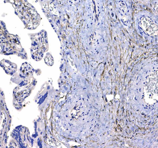 IHC analysis of CD44 using anti-CD44 antibody (A00052). CD44 was detected in paraffin-embedded section of human placenta tissue . Heat mediated antigen retrieval was performed in citrate buffer (pH6&44, epitope retrieval solution) for 20 mins. The tissue section was blocked with 10% goat serum. The tissue section was then incubated with 1µg/ml rabbit anti-CD44 Antibody (A00052) overnight at 4C. Biotinylated goat anti-rabbit IgG was used as secondary antibody and incubated for 30 minutes at 37C. The tissue section was developed using Strepavidin-Biotin-Complex (SABC)(Catalog SA1022) with DAB as the chromogen.