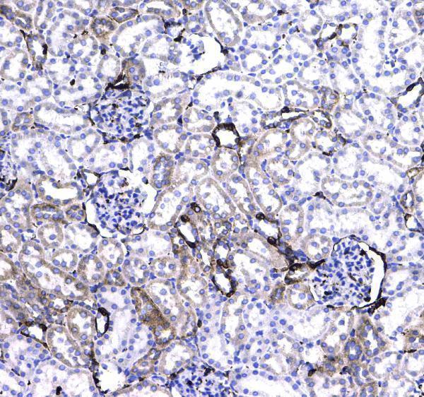 IHC analysis of CD44 using anti-CD44 antibody (A00052). CD44 was detected in paraffin-embedded section of mouse kidney tissue . Heat mediated antigen retrieval was performed in citrate buffer (pH6&44, epitope retrieval solution) for 20 mins. The tissue section was blocked with 10% goat serum. The tissue section was then incubated with 1µg/ml rabbit anti-CD44 Antibody (A00052) overnight at 4C. Biotinylated goat anti-rabbit IgG was used as secondary antibody and incubated for 30 minutes at 37C. The tissue section was developed using Strepavidin-Biotin-Complex (SABC)(Catalog SA1022) with DAB as the chromogen.