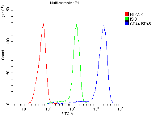 Flow Cytometry analysis of Jurkat cells using anti-CD44 antibody (A00052). Overlay histogram showing Jurkat cells stained with A00052 (Blue line). To facilitate intracellular staining, cells were fixed with 4% paraformaldehyde and permeabilized with permeabilization buffer. The cells were blocked with 10% normal goat serum. And then incubated with rabbit anti-CD44 Antibody (A00052&44,1µg/1x106 cells) for 30 min at 20C. DyLight488 conjugated goat anti-rabbit IgG (BA1127&44, 5-10µg/1x106 cells) was used as secondary antibody for 30 minutes at 20C. Isotype control antibody (Green line) was rabbit IgG (1µg/1x106) used under the same conditions. Unlabelled sample without incubation with primary antibody and secondary antibody (Red line) was used as a blank...