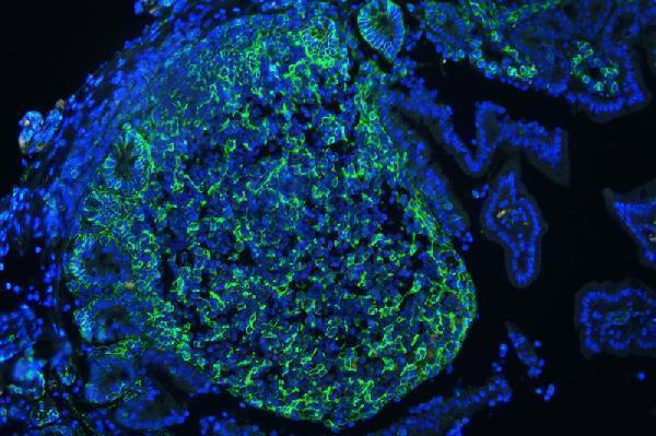 IF analysis of CD44 using anti-CD44 antibody (A00052) CD44 was detected in paraffin-embedded section of mouse lymphaden tissues. Heat mediated antigen retrieval was performed in citrate buffer (pH6&44, epitope retrieval solution ) for 20 mins. The tissue section was blocked with 10% goat serum. The tissue section was then incubated with 1µg/mL rabbit anti-CD44 Antibody (A00052) overnight at 4C. DyLight488 Conjugated Goat Anti-Rabbit IgG (BA1127) was used as secondary antibody at 1:100 dilution and incubated for 30 minutes at 37C. The section was counterstained with DAPI. Visualize using a fluorescence microscope and filter sets appropriate for the label use