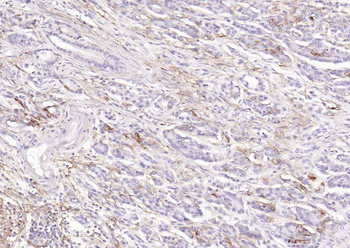 Paraformaldehyde-fixed, paraffin embedded Human Pancreatic Cancer, Antigen retrieval by boiling in sodium citrate buffer (pH6.0) for 15 min, Antibody incubation with ACE2 Polyclonal Antibody, Unconjugated (orb10029) at 1:200 overnight at 4C, followed by conjugation to the SP Kit (Rabbit) and DAB staining.
