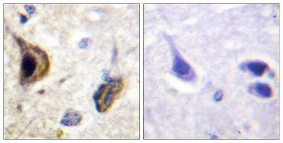 Immunohistochemistry analysis of paraffin-embedded human brain, using Kir5.1 (Phospho-Ser417) Antibody. The picture on the right is blocked with the phospho peptide.