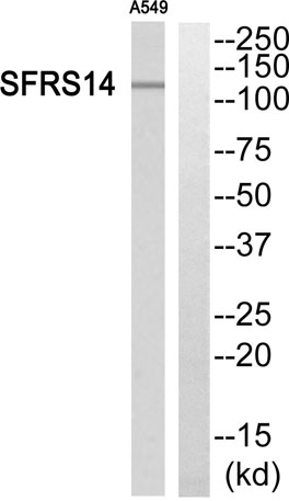 Western blot analysis of SFRS14 Antibody. The lane on the right is blocked with the SFRS14 peptide.
