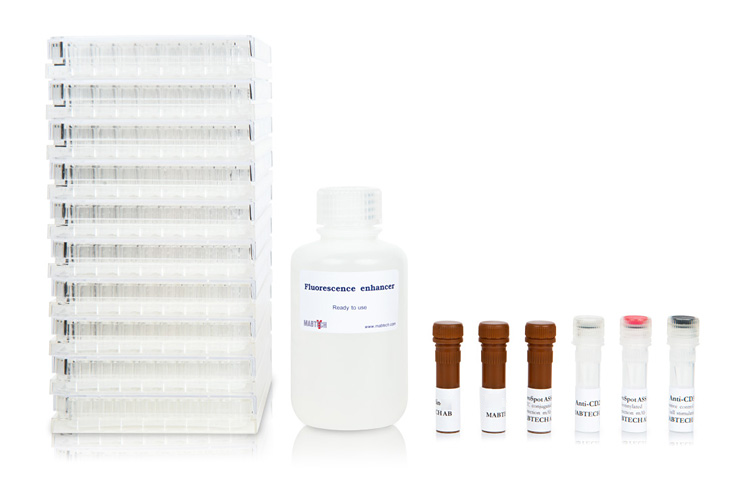 FluoroSpot kit with pre-coated plates for enumeration of cells secreting IFN-gamma and IL-10, The FluoroSpot assay is an inventive development of the ELISpot assay and uses fluorescent detection instead of colorimetric. This allows for simultaneous detection