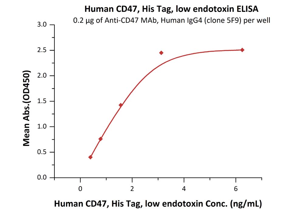 Immobilized Anti-CD47 MAb, Human IgG4 (clone 5F9) at 2 ug/mL (100 uL/well) can bind Human CD47, His Tag, low endotoxin with a linear range of 0.4-3 ng/mL (Routinely tested).