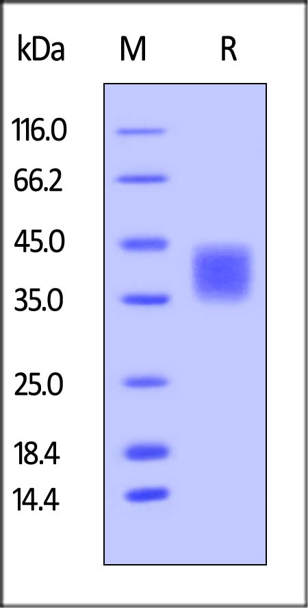 This protein carries a polyhistidine tag at the C-terminus. The protein has a calculated MW of 15.6 kDa. The protein migrates as 35-45 kDa under reducing (R) condition (SDS-PAGE) due to glycosylation.