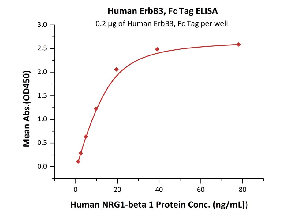 Immobilized Human ErbB3, Fc Tag at 2 ug/mL (100 uL/well) can bind Human NRG1-beta 1 Protein with a linear range of 1-20 ng/mL (Routinely tested).