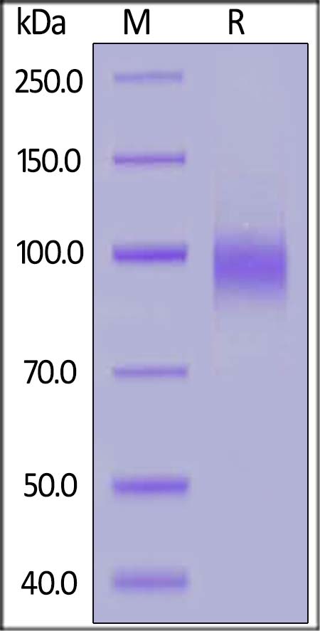 This protein carries a polyhistidine tag at the C-terminus. The protein has a calculated MW of 70.5kDa. The protein migrates as 95-120 kDa under reducing (R) condition (SDS-PAGE) due to glycosylation.