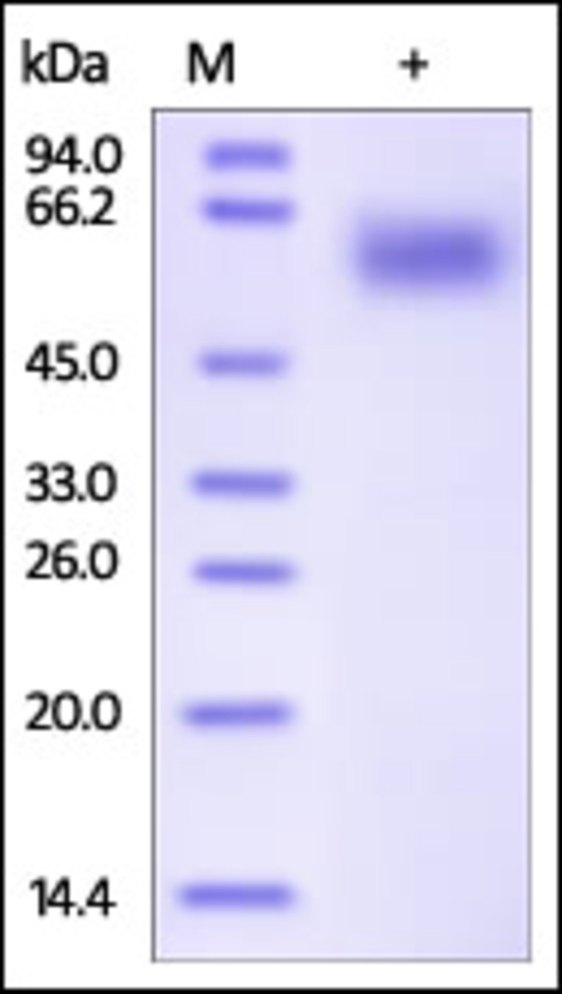 The purity of rh IL1RAP / IL-1RAcP / IL1R3 was determined by DTT-reduced (+) SDS-PAGE and staining overnight with Coomassie Blue. |