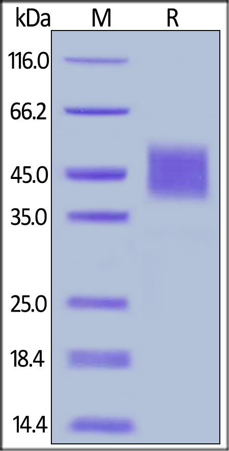 Cynomolgus / Rhesus macaque IL-4 R alpha, His Tag on SDS-PAGE under reducing (R) condition. The gel was stained overnight with Coomassie Blue. The purity of the protein is greater than 95%.