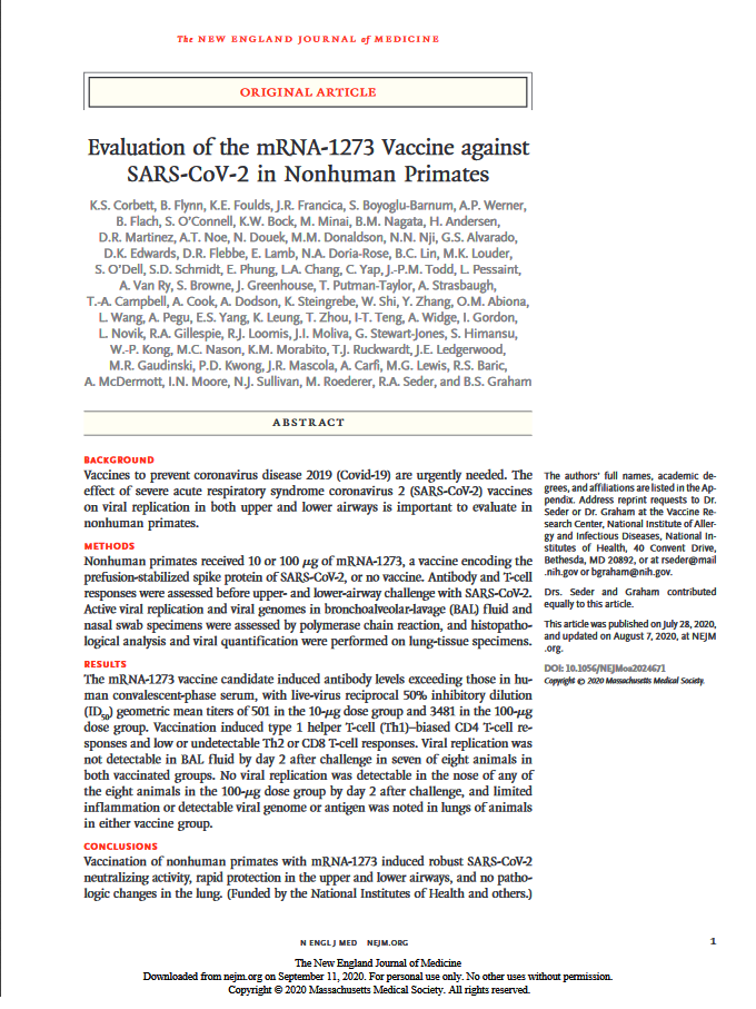 In this study, nonhuman primates received 10 or 100 μg of mRNA-1273, a vaccine encoding the prefusion-stabilized spike protein of SARS-CoV-2, or no vaccine. Antibody and T-cell responses were assessed before upper- and lower-airway challenge with SARS-CoV-2. Active viral replication and viral genomes in bronchoalveolar-lavage (BAL) f luid and nasal swab specimens were assessed by polymerase chain reaction, and histopatho-logical analysis and viral quantification were performed on lung-tissue specimens. Vaccination of nonhuman primates with mRNA-1273 induced robust SARS-CoV-2 neutralizing activity, rapid protection in the upper and lower airways, and no patho-logic changes in the lung. The authors conclude that vaccination of nonhuman primates with mRNA-1273 induced robust SARS-CoV-2 neutralizing activity, rapid protection in the upper and lower airways, and no patho-logic changes in the lung.