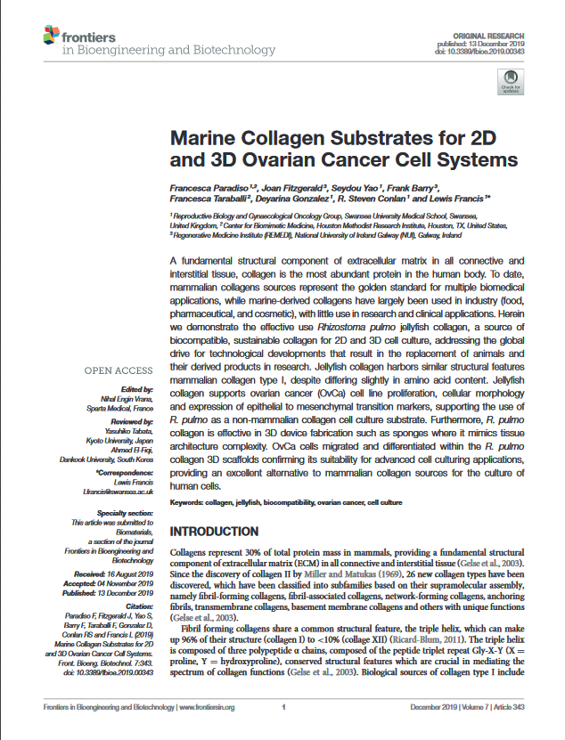 The recent publication in the journal Frontiers in Bioengineering and Biotechnology titled ‘Marine Collagen Substrates for 2D and 3D Ovarian Cancer Cell Systems’ has demonstrated that jellyfish collagen provides a reliable in vitro micro-environment for the proliferation and migration of Ovarian cancer cells. (OvCa.3 & SKOV.3).