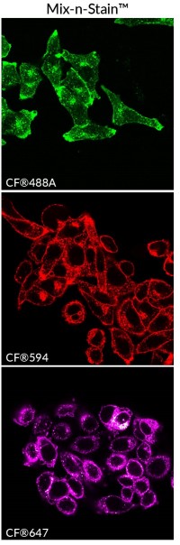 Mix-n-Stain™ Antibody Labeling Kits dramatically simplify the process of preparing fluorescently labeled antibodies, particularly primary antibodies. Simply mix your antibody with the dye or protein of your choice. After 30 minutes and without a separation step, you will have a covalently labeled antibody conjugate that is as good as a commercial pre-labeled fluorescent antibody (Figure left).