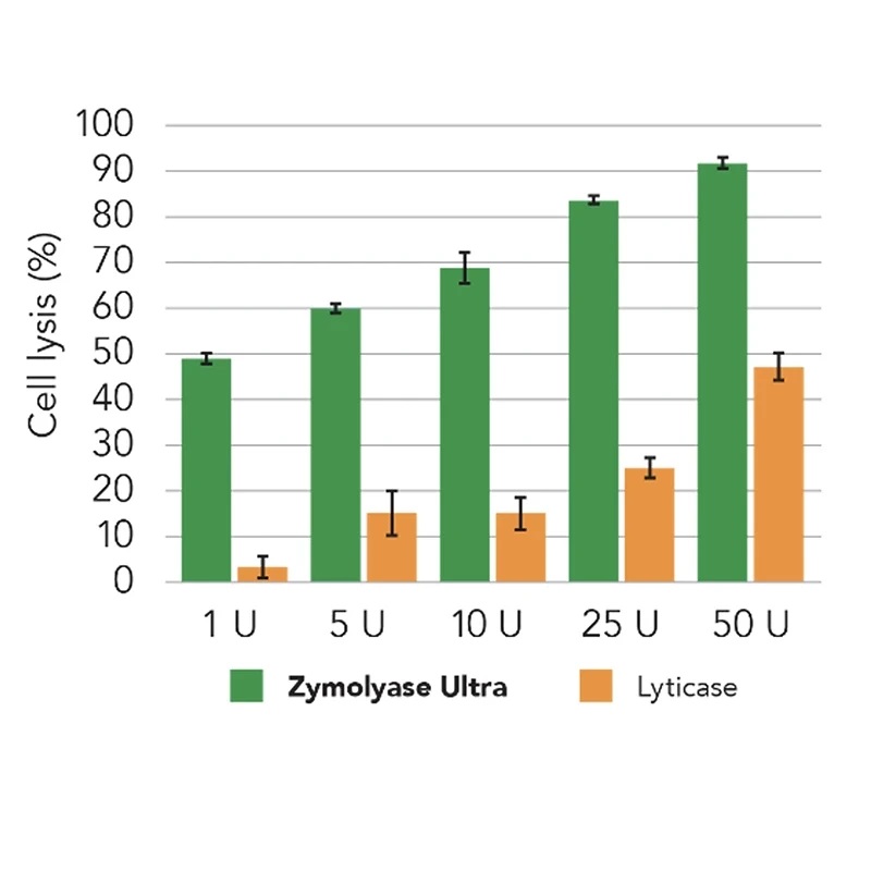 Digestion of yeast and fungal cell walls is necessary for many experimental procedures. Lytic enzymes like Zymolyase, Lyticase, Glucanase or Chitinase are routinely used for digestion of cell walls. Distinguished from conventional lytic enzymes, Zymolyase Ultra is a novel formulation of enzyme that is optimized for efficient yeast cell wall digestion. It contains enzymes that can degrade several different components of yeast cell walls. It is extensively purified using a novel DNA/RNA removal technology that results in extremely low nucleic acid contamination. It is suitable for qPCR and sequencing-based assays where low DNA/RNA contamination is critical.