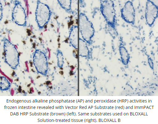 BLOXALL Endogenous Peroxidase and Alkaline Phosphatase Blocking Solution is a dual enzyme blocking reagent that inactivates endogenous peroxidase, pseudoperoxidase, and alkaline phosphatase in formalin-fixed, paraffin-embedded tissue sections, frozen tissue sections, and cell preparations.
