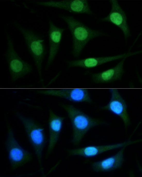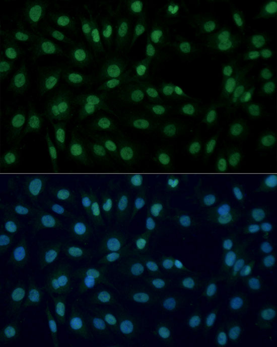 Confocal immunofluorescence analysis of U-2 OS cells using PARP1 Rabbit pAb (A0010) at dilution of 1:200. Blue: DAPI for nuclear staining.