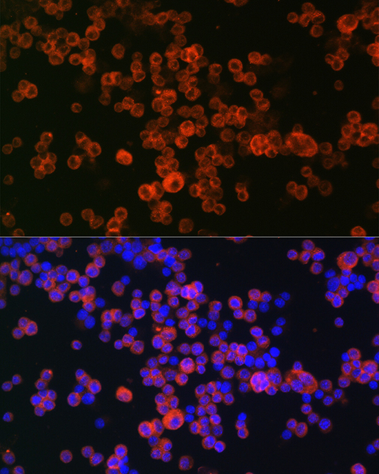 Immunofluorescence analysis of RAW264.7 cells using CD68 Rabbit pAb (A13286) at dilution of 1:50 (40x lens). Secondary antibody: Cy3-conjugated Goat anti-Rabbit IgG (H+L) (AS007) at 1:500 dilution. Blue: DAPI for nuclear staining.