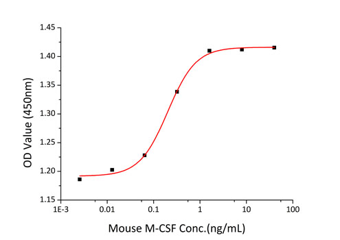 Recombinant Mouse CSF-1/M-CSF stimulates cell proliferation of the M-NFS-60 mouse myelogenous leukemia lymphoblast cells. The ED<,sub>,50<,/sub>, for this effect is 8.31-33.24 ng/mL, corresponding to a specific activity of 3.01*10<,sup>,4<,/sup>,~1.20*10<,sup>,5<,/sup>, units/mg.
