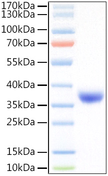 Recombinant SARS-COV-2 Spike RBD(L452R,T478K) Protein was determined by SDS-PAGE under reducing conditions with Coomassie Blue.