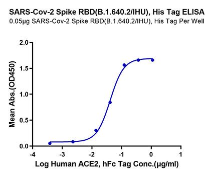 Immobilized SARS-Cov-2 Spike RBD (B.1.640.2/IHU) , His Tag at 0.5µg/ml (100µl/well) on the plate. Dose response curve for Human ACE2, hFc Tag with the EC<,sub>,50<,/sub>, of 41.3ng/ml determined by ELISA.