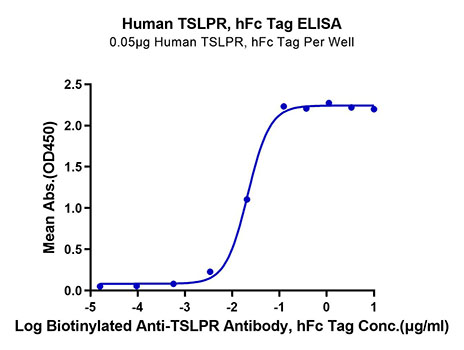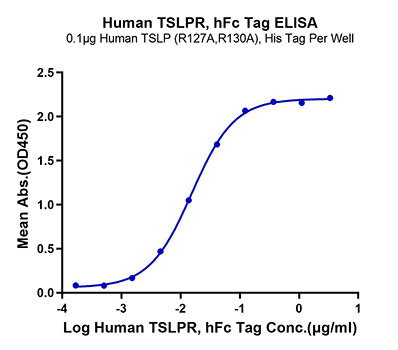 Immobilized Human TSLP (R127A, R130A) at 1µg/ml (100µl/Well). Dose response curve for Human TSLPR, hFc Tag with the EC<,sub>,50<,/sub>, of 15.5ng/ml determined by ELISA.