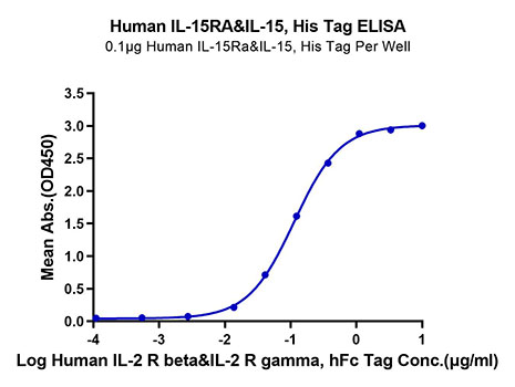 Immobilized Human IL-15RA&,IL-15, His Tag at 1µg/ml (100µl/well) on the plate. Dose response curve for Human IL-2 R beta&,IL-2 R gamma, hFc Tag with the EC<,sub>,50<,/sub>, of 0.11µg/ml determined by ELISA.