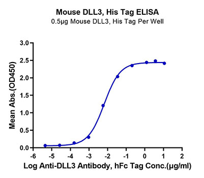 Immobilized Mouse DLL3, His Tag at 5µg/ml (100µl/well) on the plate. Dose response curve for Anti-DLL3 Antibody, hFc Tag with the EC<,sub>,50<,/sub>, of 6.5ng/ml determined by ELISA.