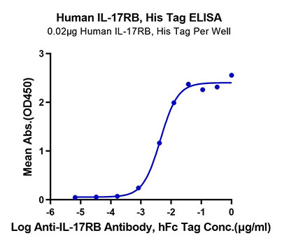 Immobilized Human IL-17RB, His Tag at 0.2µg/ml (100µl/well) on the plate. Dose response curve for Anti-IL-17RB Antibody, hFc Tag with the EC<,sub>,50<,/sub>, of 4.4ng/ml determined by ELISA.
